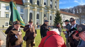 Nachdem sich die Gruppe bei strahlendem Sonnenschein augestellt hatte spielte der Posaunenchor. Der Oberbürgermeister Götz hielt seine Neujahrsansprache mit einem Rückbloick auf das turbulente vergangene Jahr.